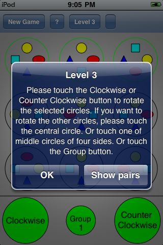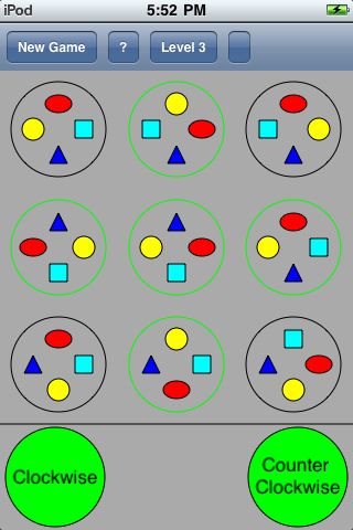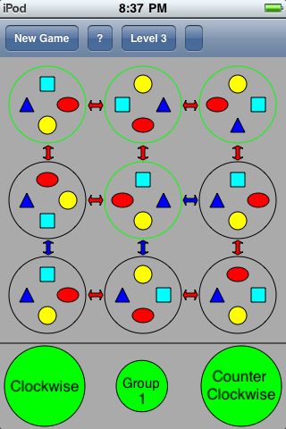 For Level 1, the player could rotate each circle with the central circle at the same time, which is one of eight pre-defined groups. For Level 2, there is one additional feature to allow the player to rotate the outside eight circles around the central circle in the LOOP mode. For Level 3, the circles are rotated in five pre-defined groups.
