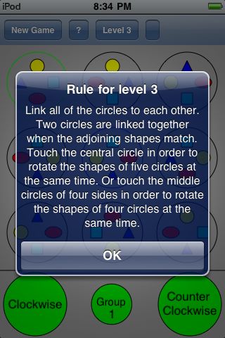 Objective: link all of the circles to each other. Two circles are linked together when the adjoining shapes match. To win, each circle must be linked to all of the circles surrounding it. For example, the circle at the center of the screen must be linked to all four circles surrounding it.