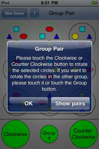 To obtain help inside the game, press the ? button. The ? button also provides a way to show the player the matched pairs and unmatched pairs in the game by pressing the Show pairs button.