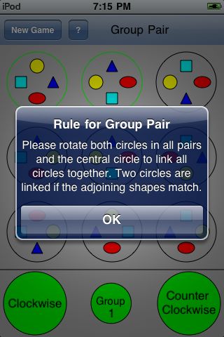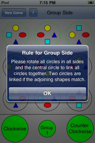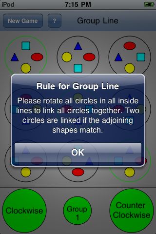 Objective: link all of the circles to each other. Two circles are linked together when the adjoining shapes match. To win, each circle must be linked to all of the circles surrounding it. For example, the circle at the center of the screen must be linked to all four circles surrounding it.